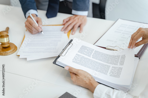 Lawyer Legal counsel presents to the client a signed contract with gavel and legal law. justice and lawyer Business partnership meeting concept.