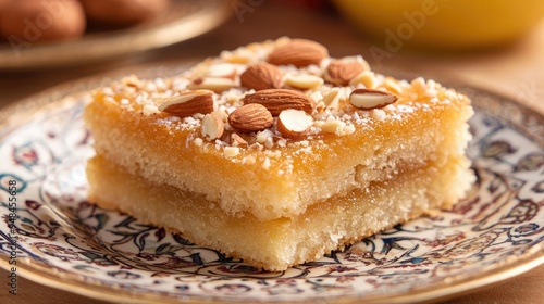 Layered Basbousa slices garnished with almonds, served on a beautifully patterned plate with a background that hints at an Arabic market scene