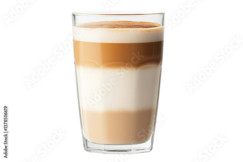 Layered iced coffee latte in tall glass with frothy milk and espresso, cut out