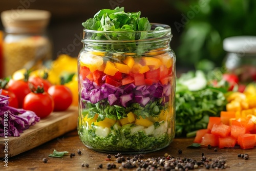 Layered Salad in a Glass Jar with Fresh Vegetables