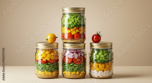 Layered vegetable salads in glass jars with gold lids on beige background