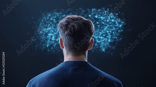 leadership development concept. Man observing a digital network visualization against a dark background.