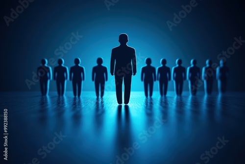 Leading the Way: A powerful silhouette of a single leader standing tall, illuminated by a bright light, symbolizing guidance and inspiration in a sea of followers.