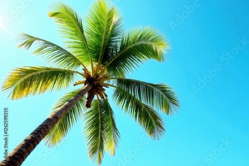 Leaning palm, vibrant green leaves against clear sky, texture, single, tree