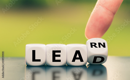 Learn and Lead. Hand turns a dice and changes the word "learn" to "lead".