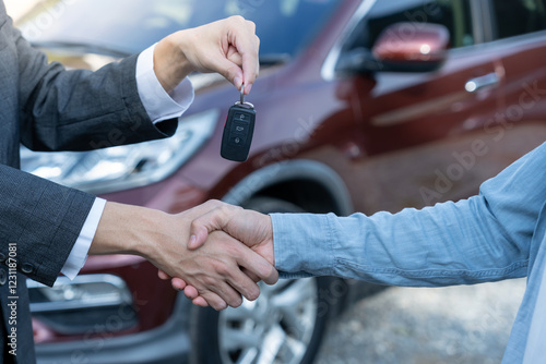lease, rental car, sell, buy. Dealership shake hand customer for new Car. Sales, loan credit financial, rent vehicle, insurance, renting, Seller, dealer, installment, car care business