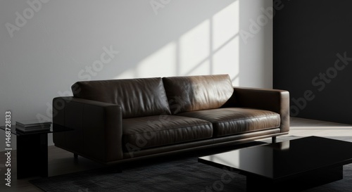 couch, sofa, leather, furniture, interior, room, home, design, modern, minimalist, white, black, dark, light, window, sunlight, shadow, living room, relaxation, comfort, indoor, contemporary, style, apartment, decor, house, residence, seat, cushion, table, surface, architecture, domestic, elegant, luxury, simple, clean, empty, nobody, daytime