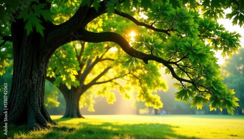 Leaves and branches of a majestic oak in morning light, tree leaves, serene, oak tree