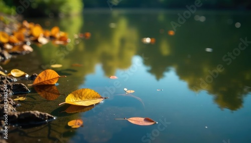 Leaves scattered on the pond surface, serene scene, tranquility, reflection