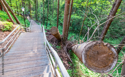 forest, park, pavement, road, railing, tree, fence, green, summer, rythm