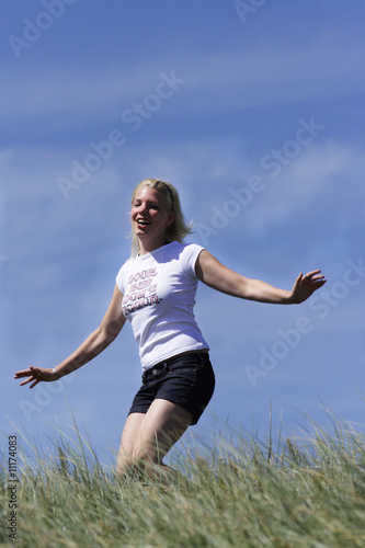girl, high spirits, meadow, heaven, grass, blond, summer, jump, temperament, laugh, fun, luck, happy