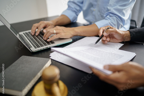 Legal counsel presents to the client a signed contract with gavel and legal law. justice and lawyer concept