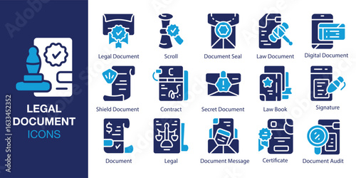 Legal Document icon set. Containing Legal Document, Scroll, Document Seal, Law Document, Digital Document, Shield Document and more. Solid vector icons collection. Vector illustration.
