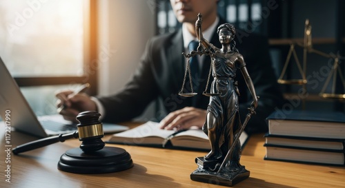Legal office setting, Lady Justice statue in foreground, scales of justice, blindfolded figure