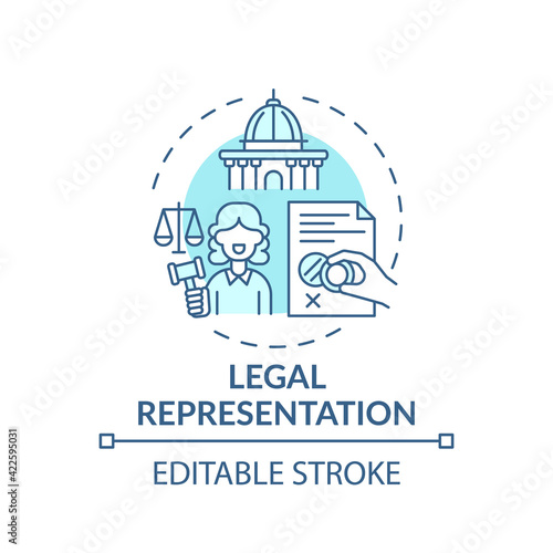 Legal representation concept icon. Legal services categories. Protecting clients in judicial and administrative idea thin line illustration. Vector isolated outline RGB color drawing. Editable stroke