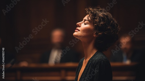 Legal Witness: Empowered Woman Giving Emotional Testimony at Courtroom Trial for Justice and Against Injustice