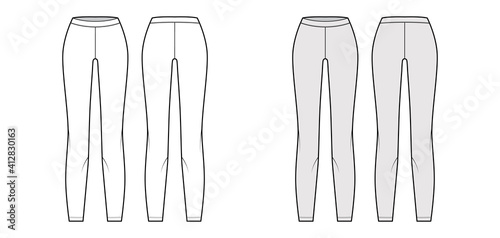 Leggings knit pants technical fashion illustration with low waist, rise, full length. Flat sport training, bottom trousers apparel template front, back, white grey color. Women men unisex CAD mockup