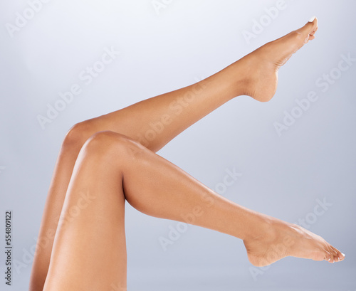 Legs, wellness and skincare for cosmetics, health or on grey studio background. Leg, grooming or smooth skin with soft, leg or self care for wellbeing, shaving or beauty for epilation at spa barefoot