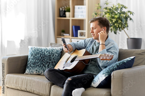 leisure, music and people concept - young man or musician with guitar, earphones and smartphone sitting on sofa at home