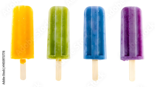 Lemon, Apple, Raspberry, Grape popsicle ice cream transparent PNG set bundle, isolated background. Yellow, green, blue, purple colorful classic summer flavour, parlour shop menu desser