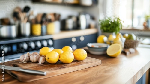Lemons and Garlic on a Wooden Cutting Board in a Bright Kitchen