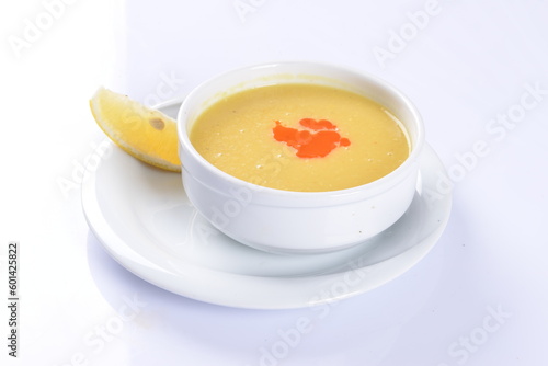 Lentil Soup with lemon and hot oil sauce, in white bowl