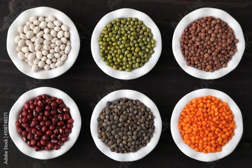 lentil, bean, bowl, ceramic, brown, food, green, red, grain, diet, health food, legume, vegetarian, natural, vegan, different, assortment, row, ingredient, nourishment, dark