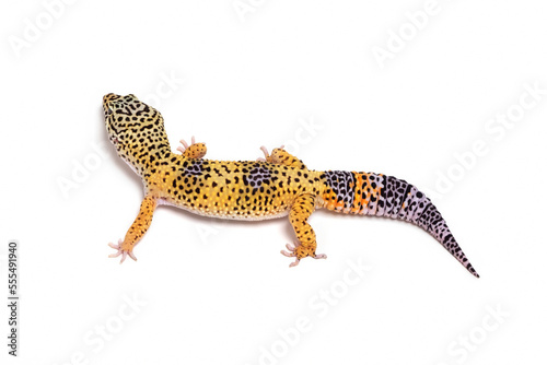 Leopard gecko (Eublepharis macularius) on a white background; Studio