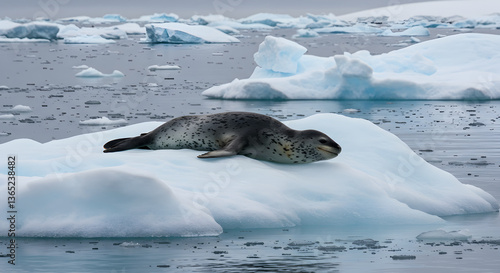 Leopard seal resting peacefully on a floating ice floe in antarctic waters