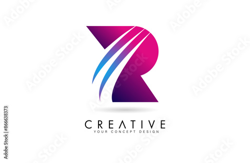 Letter R Logo Design in purple blue colors with negative space Swooshes and creative font cut