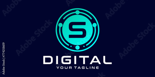 letter S technology logo. Digital font vector design for industry with circuit circles and dots, for digital, technology,data