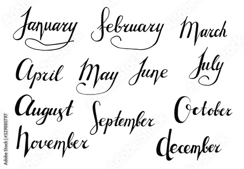Lettering, art text: 12 months of the year: January, February, March, April, May, June, July, August, September, October, November, December. Vector illustration, graphic design for calendars.