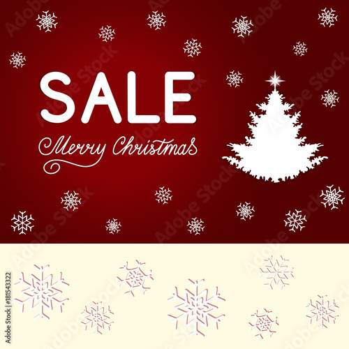 Lettering Sale, Merry Christmas, fir tree with white snowflakes on a red background. Winter concept for banner, poster, coupons, cards, invitations for shopping. Ads, Deals. Vector illustration EPS 8