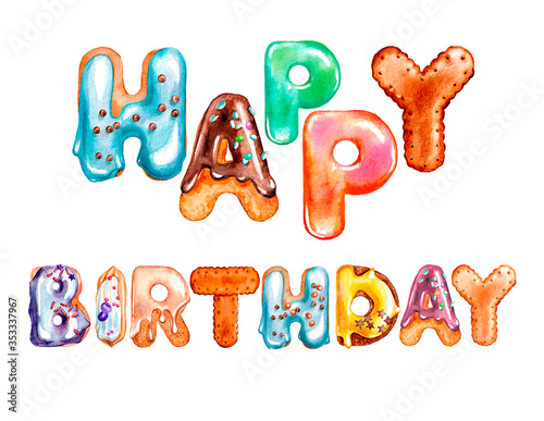 Letters in sweet glaze, caramel, cookies, watercolor drawing.Sweet holiday greeting, postcard design, banner,t-shirt print, children's holiday, birthday