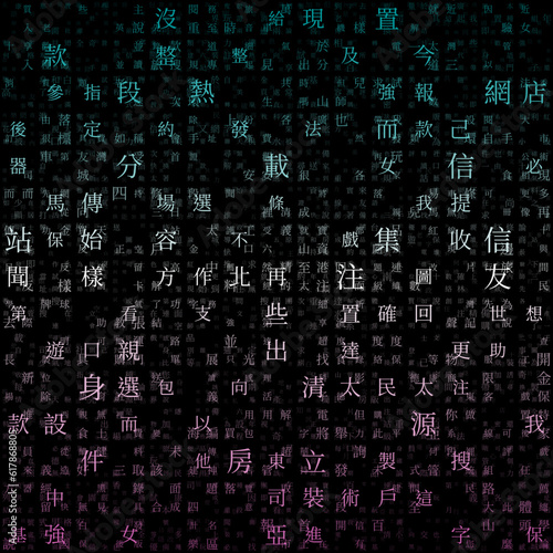 Letters Matrix Background. Random Characters of Chinese Traditional Alphabet. Gradient matrix pattern. Teal and purple color theme backgrounds. Tileable horizontally. Neat vector illustration.