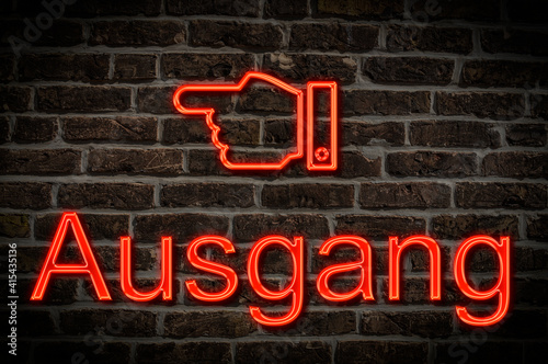 exit, door, goal, german, signpost, information board, signs, pointing, display, neon sign, red, light, hand, finger, forefinger, wall, brick wall, wall, evening, night, display, shiny, lighting, plate, arrow, symbol, horizontal format, horizontal, hint, object, object, detail