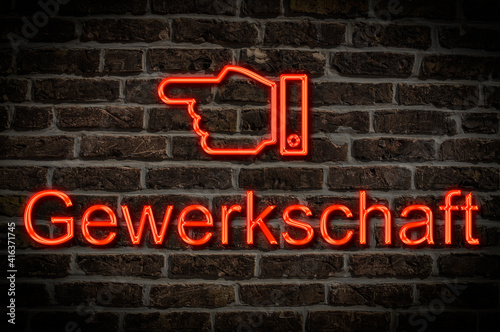 union, amalgamation, merger, collective, german, signs, pointing, display, neon sign, red, light, hand, finger, forefinger, information board, wall, brick wall, wall, evening, night, display, shiny, lighting, plate, arrow, symbol, horizontal format, horizontal, hint, object, object, detail