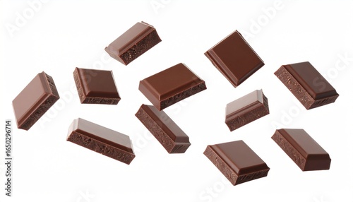 Levitating dark chocolate chunks isolated on white background with copy space, perfect for dessert themes, confectionery design, gourmet food photography, and sweet treat projects.