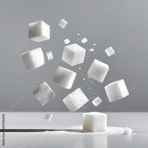 lump sugar, sugar, cube, white, levitation, floating, falling, fly, movement, motion, dynamic, energy, food, sweet, dessert, ingredient, confectionery, bakery, cooking, kitchen, white background, grey background, minimalist, clean, pure, single object, closeup, macro, still life