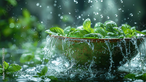 Levitation image of Molokhia soup, with droplets of olive oil and Molokhia leaves floating