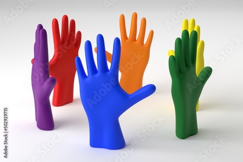 LGBT culture concept. Hands in the colors of the rainbow flag on a white background. 3D render
