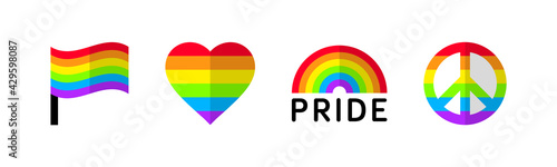 LGBT Pride Icon Set. Set of LGBTQ Gay Pride Illustration Icons with LGBT Flag Rainbow Colours. Flag, Heart, Rainbow and Peace Sign Icons for LGBTQIA+ Pride