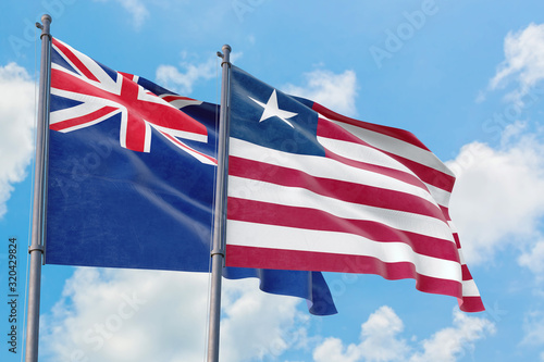 Liberia and Anguilla flags waving in the wind against white cloudy blue sky together. Diplomacy concept, international relations.