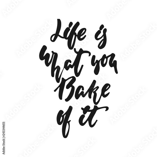 Life is what you Bake of it - hand drawn positive lettering phrase about kitchen isolated on the white background. Fun brush ink vector quote for cooking banners, greeting card, poster design.