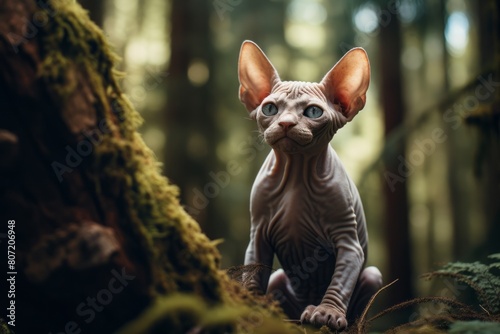 Lifestyle portrait photography of a cute sphynx cat investigating over forest background