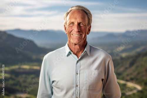 Lifestyle portrait photography of a grinning mature man wearing an elegant long-sleeve shirt against a scenic mountain overlook background. With generative AI technology