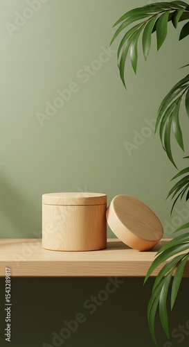 wood, cylinder, beige, light, green, background, palm, leaf, shelf, minimalist, product, display, natural, organic, simple, clean, presentation, scene, studio, texture, grain, smooth, round, cylindrical