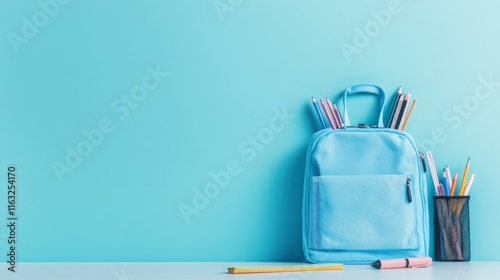 Light blue backpack with stationery supplies on classroom desk, perfect for back-to-school or educational themes, space for text for customization
