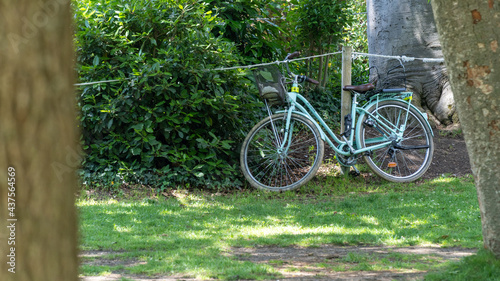 Light blue city bike near green bushes, glimpsed between two tree trunks
