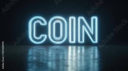 coin, neon, text, symbol, light, blue, light blue, cyan, reflective, surface, floor, ground, shiny, bright, glowing, illuminated, digital, finance, money, currency, technology, futuristic, abstract, signs, lettering, font, typography, three-dimensional, render, graphic, design, transparent
